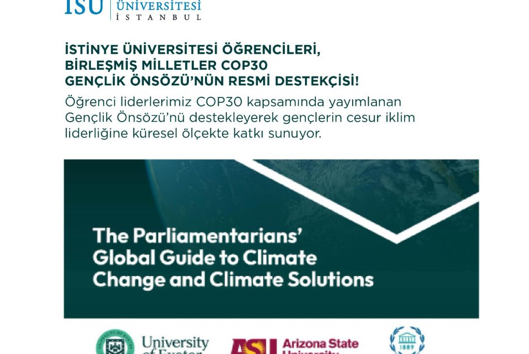 Birleşmiş Milletler İklim Değişikliği Konferansı COP30, 10–21 Kasım tarihlerinde Brezilya’da gerçekleşti. Zirve kapsamında, dünya parlamenterlerine yönelik hazırlanan Parlamenterler için Küresel İklim Değişikliği ve İklim Çözümleri Rehberi (Parliamentarians’ Global Guide to Climate Change and Climate Solutions) yayımlandı. Rehberin Gençlik Önsözü (Youth Foreword) bölümüne dünya genelinde pek çok kurum destek verirken, Türkiye’den bu bölümü desteklete tek kurum İstinye Üniversitesi Lider Öğrenci Grubu oldu.